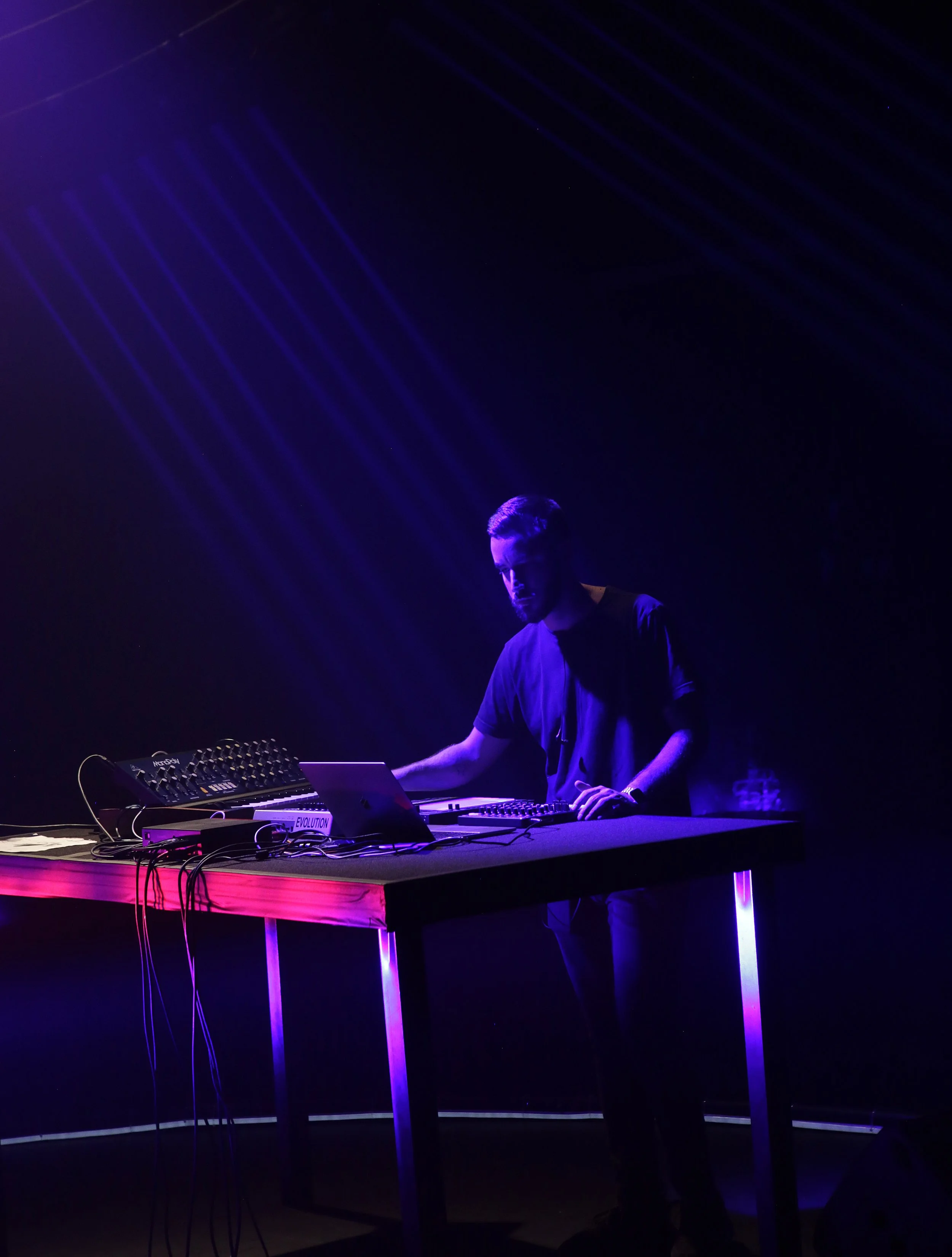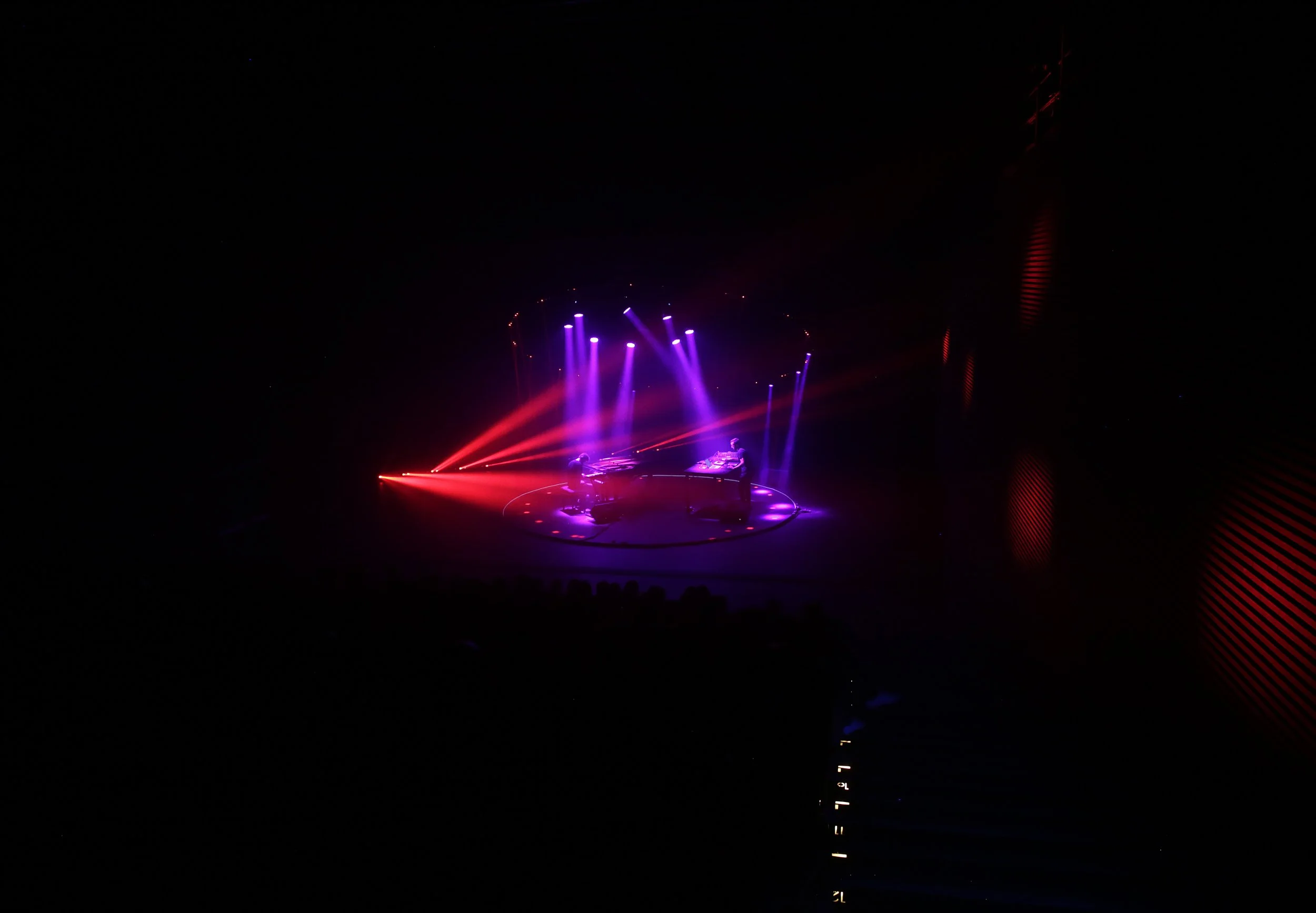 Maxi Gilbert ( XLR Estudio) has designed the scenography and the illumination for the live show. Playing with the idea of the circle - a wink to the parenthesis symbol - and with a clear hypnotic intention of the light, Gilbert created a fine and essential visual companion for the proposed journey for the live concert. He has created opposed nuances, from delicate and elegant lights, to enveloping and forceful sensations.